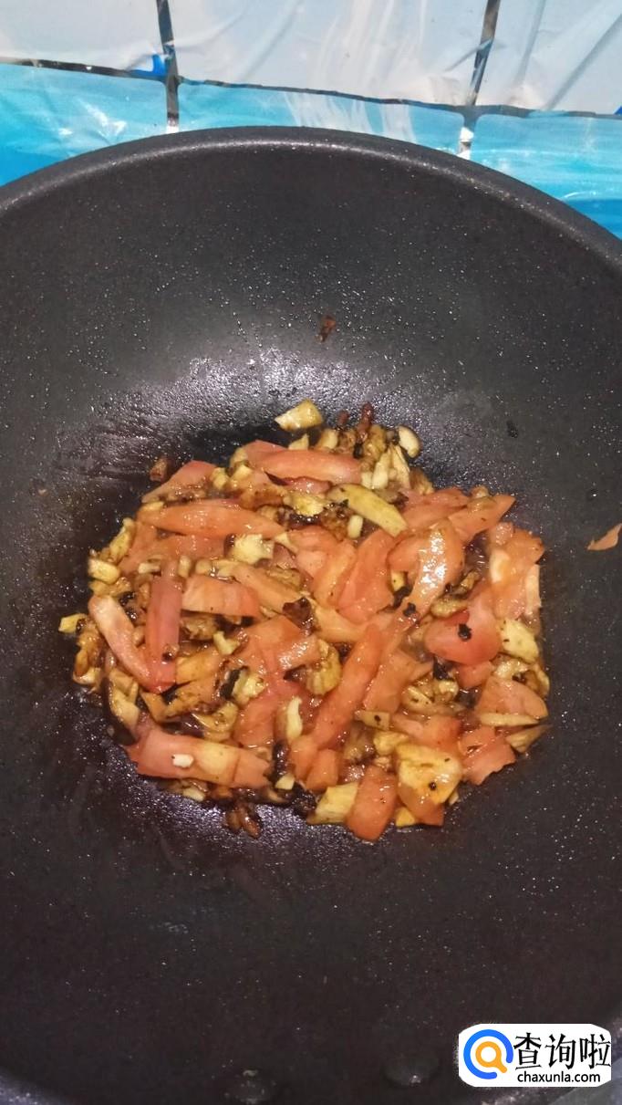 将准备好的西红柿放入锅中,将西红柿炒软。