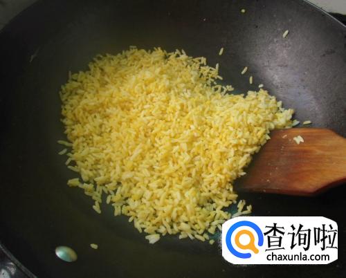 等到鸡蛋颜色从浅黄,变成深黄、土黄的时候,倒入米饭继续翻炒,这时候的鸡蛋就特别香。注意:米饭倒进去以后,快速用锅铲去碾压饭坨,全部碾碎,快速翻炒