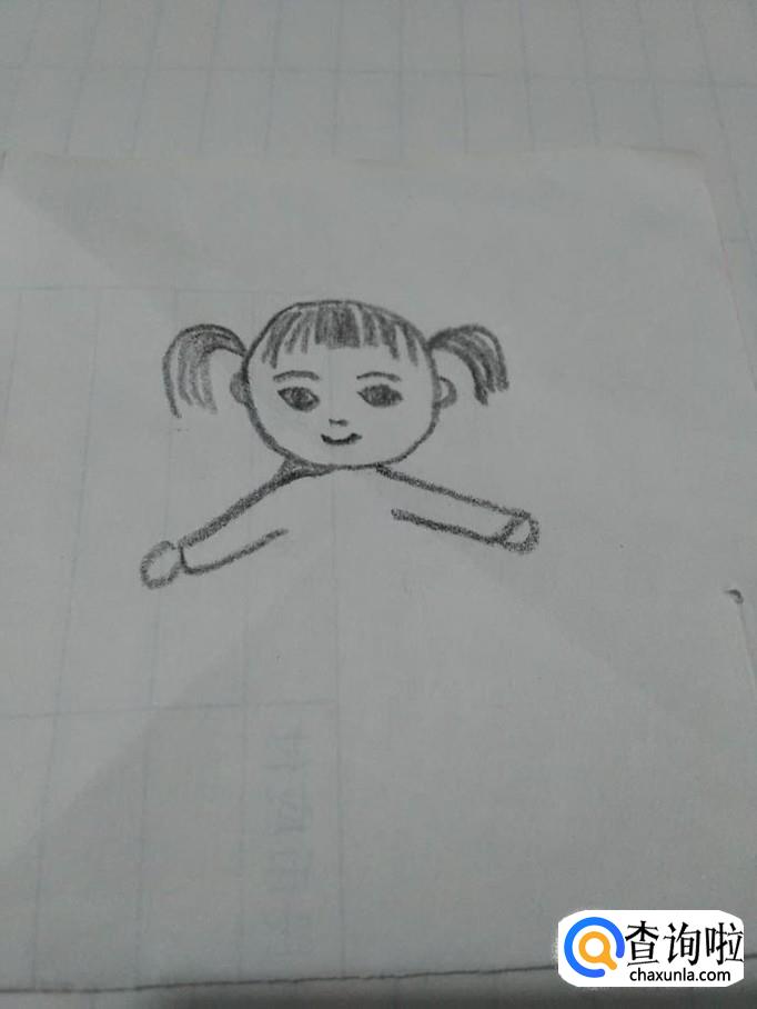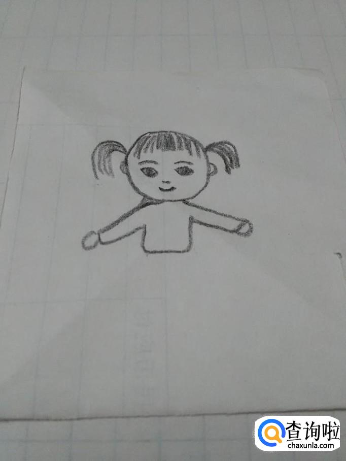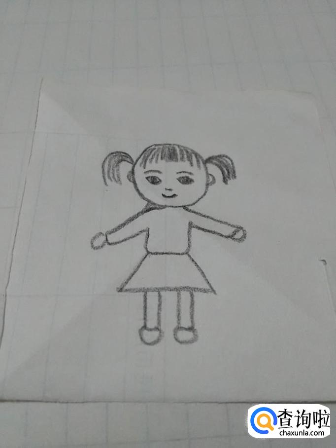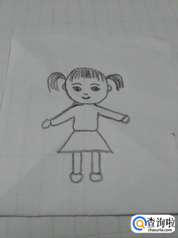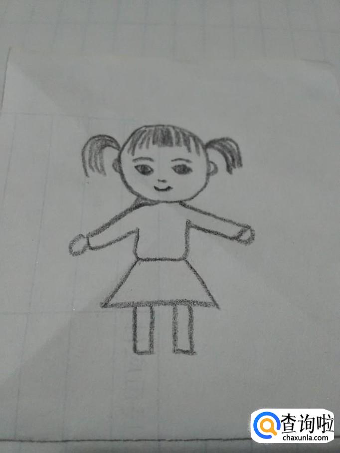 在上衣的下面画一个梯形,表示小裙子,在裙子下面画两个长方形,表示腿。