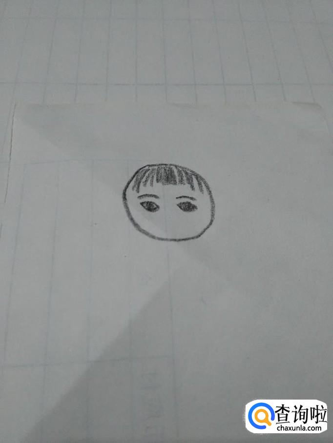 在刘海下面画两条弧线,表示眉毛,画两个椭圆形,表示大眼睛,在眼睛里面画两个圆点,表示眼珠。