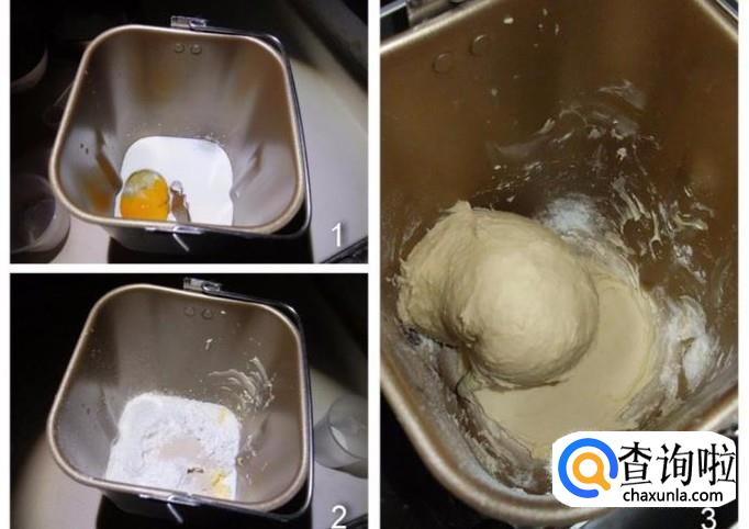 按如下图所示的方式和好面团,选择软一点的黄油,放置在碗中,然后加入我们提前备好的自发面团,搅拌均匀,再次揉成面团,如下图3