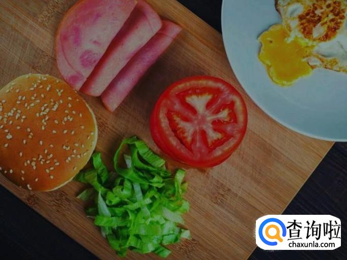 然后我们准备好配料,如下图,鸡蛋,西红柿,生菜,火腿,也可根据个人喜好准备。
