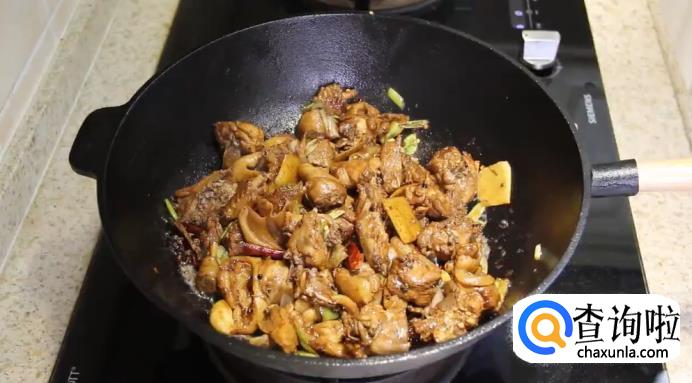 接着,再将鸭肉放进去翻炒,直至炒出鸭油。然后放入老抽、生抽一起翻炒上色入味。
