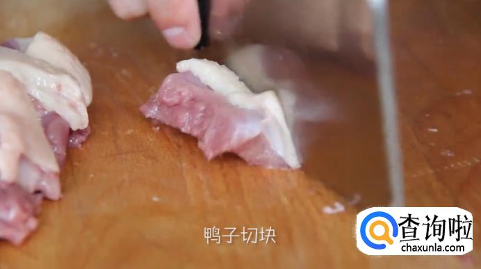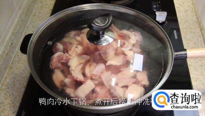 将切好的鸭肉冷水下锅,开大火煮开之后捞出来冲洗干净。