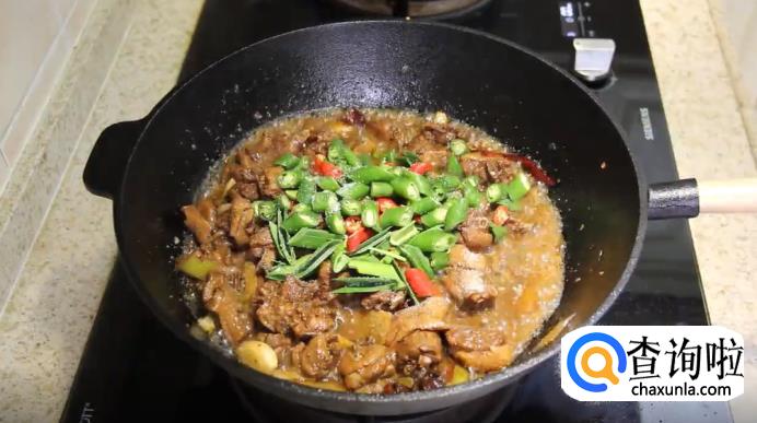 待时间到之后,打开锅盖,开大火进行收汁。然后再加入青蒜叶、小红尖椒、指天椒和盐,翻炒均匀后即可出锅。