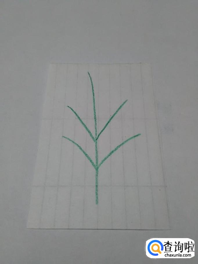 先用笔在纸上画五条相连的弧线,中间一条最长,两边分别画两条短的弧线,表示菊花叶子的叶脉。