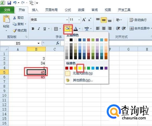 首先,我们打开我们电脑上面的一个excel文档,我们点击选中一个含有颜色的单元格,之后我们点击填充颜色边上的下拉箭头,之后我们点击黄色;