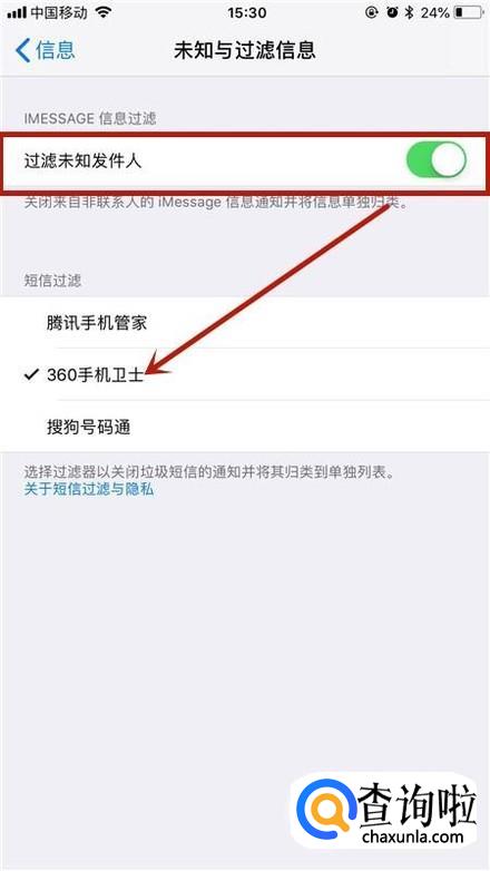最后点击开启过滤未知发件人开关并选择我们要使用的软件,如下图所示。你学会了吗?赶快动手试一试吧!