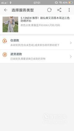 根据提示填写服务类型,未收到货则选“仅退款,”已收到货则选择“退款退货。”