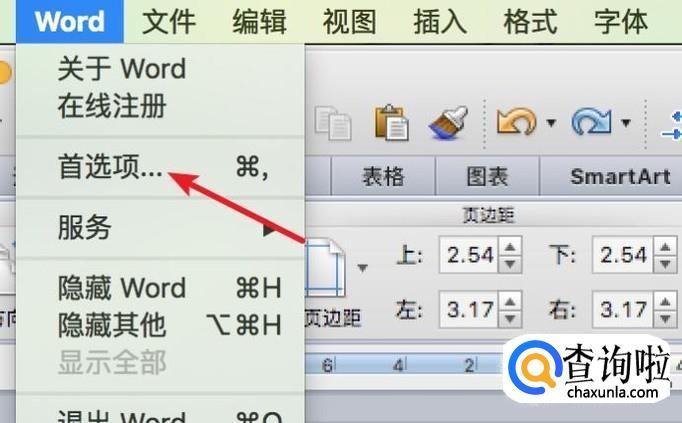 我们点击菜单栏上的word,再点击首选项