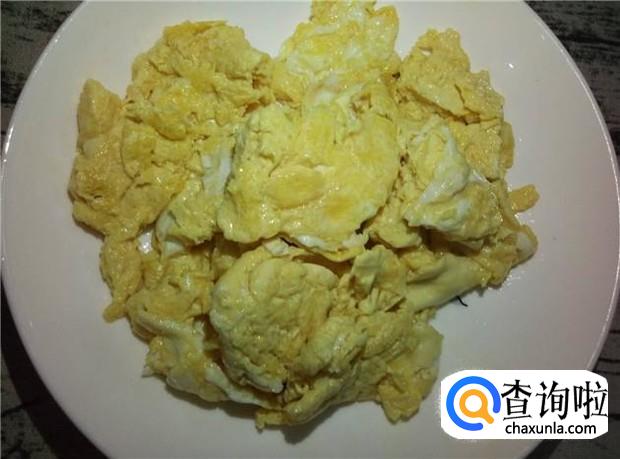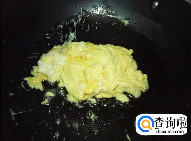 把鸡蛋炒到八成熟,用锅铲弄成一小块一小块,然后装盆,备用。