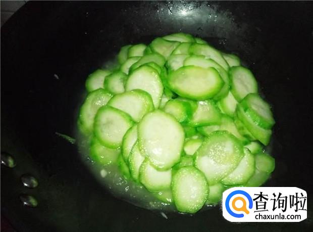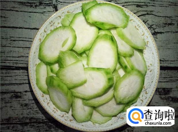 丝瓜削皮,切掉头尾,然后切成薄片。