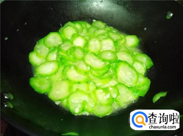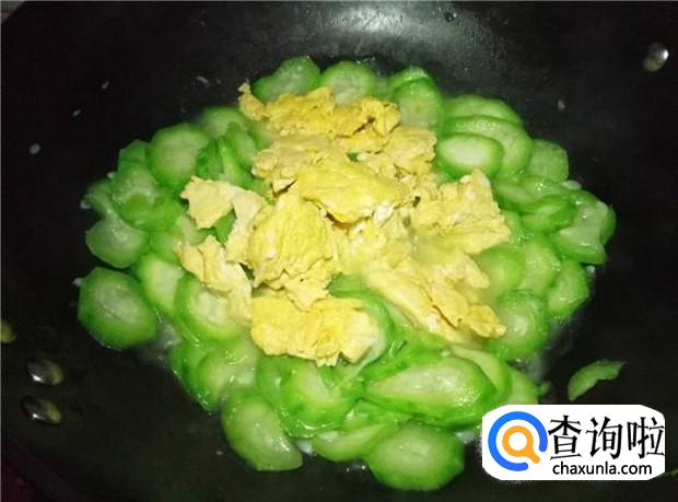 丝瓜本身炒熟也会散发一部分的水,所以不需要加太多水,加一点点水,保证丝瓜不沾锅即可。丝瓜炒软后,倒入鸡蛋。