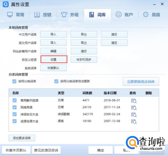 点击自定义短语处的【设置】。