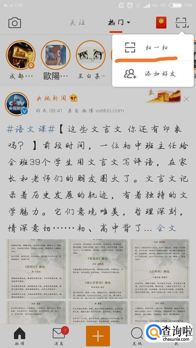 打开手机上的新浪微博客户端,点击右上角的图标,如下图所示