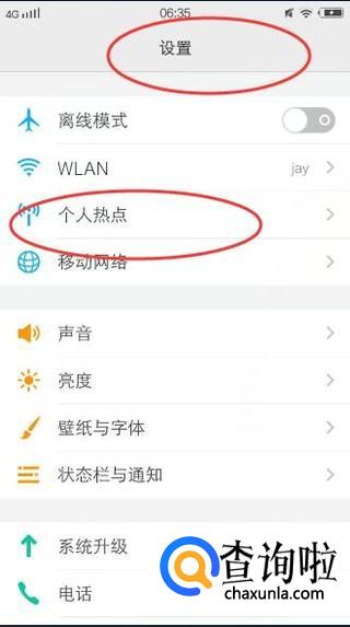 在弹出的【设置】中选择【个人热点】,如下图所示: