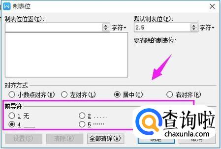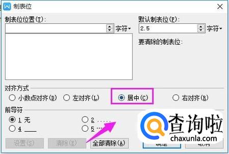 在这里我们就可以设置对齐方式,小编以居中对齐为例介绍,右上方是要清除制表位字符设置,如图。