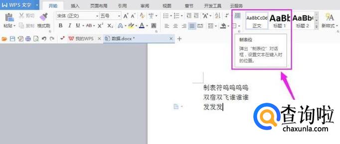 我们看到菜单栏,点击上方的开始下方的“制表位”,如图。