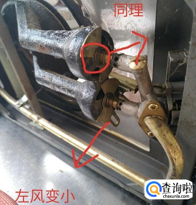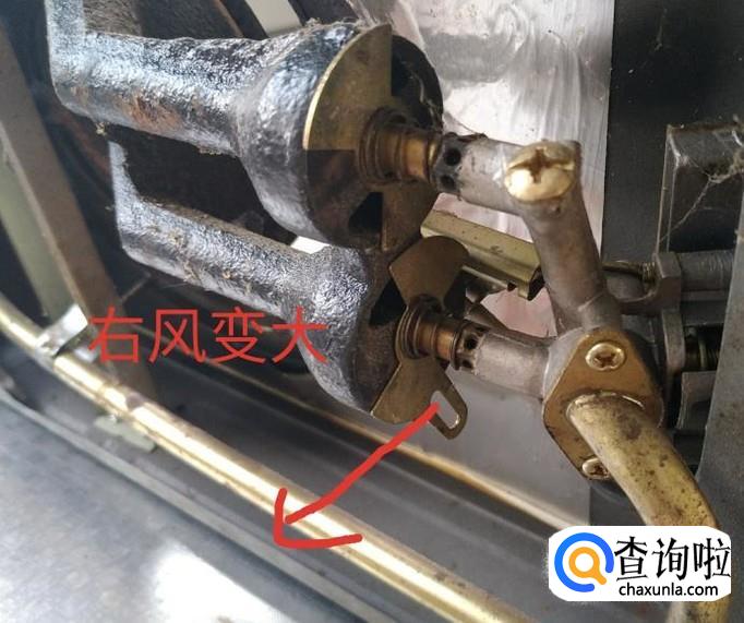 如图找到了风门之后,向右调节风门开放是变大的。提前观察燃气灶的火光调节。