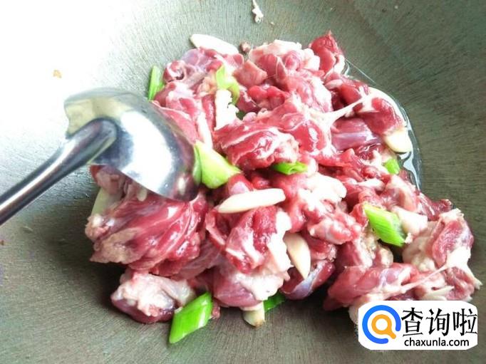 大蒜和小葱炒出香气之后,把切好的羊肉放进去翻炒,直到翻炒到羊肉发白变色,然后加上点水盖上锅盖稍微的闷一下。