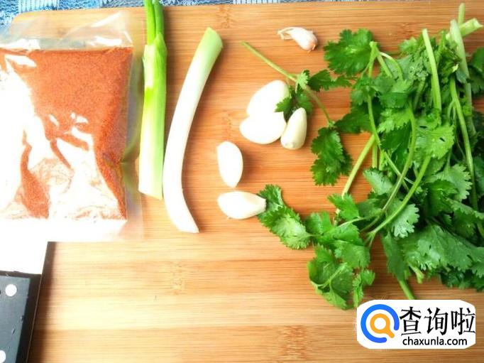 清炒羊肉按理说要放红辣椒的,说实话我真的忘了买红辣椒,也忘了买生姜(哎哎),但是没关系,咱们有香菜、小葱和大蒜呀,还有点红辣椒面,大蒜切成片,葱切段,香菜切成段。