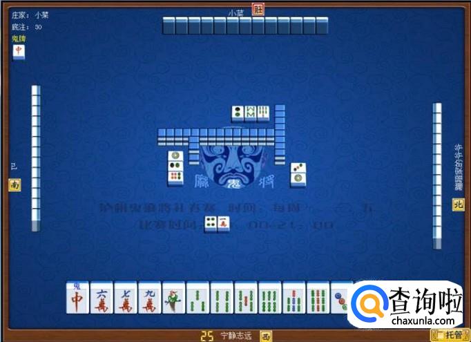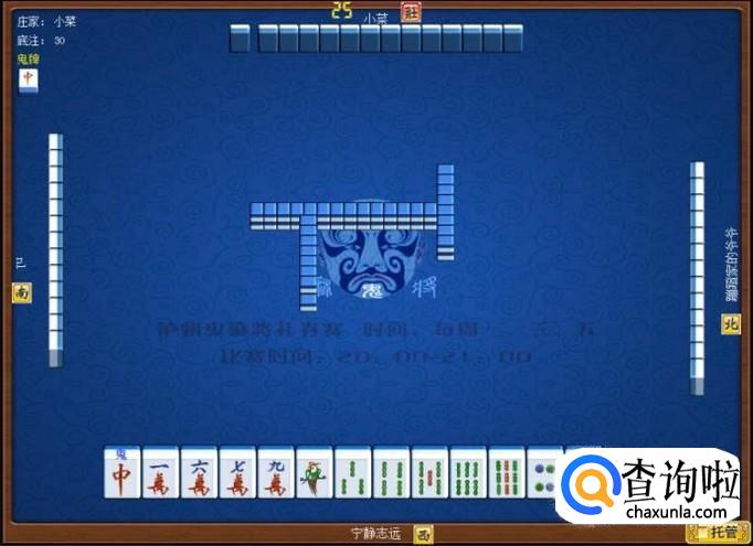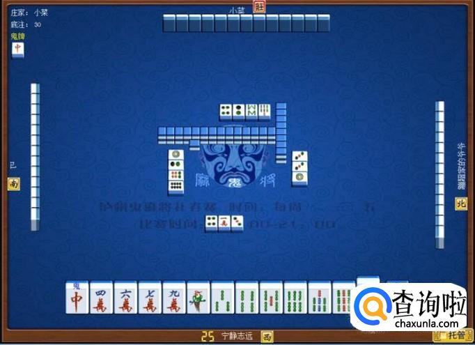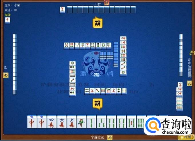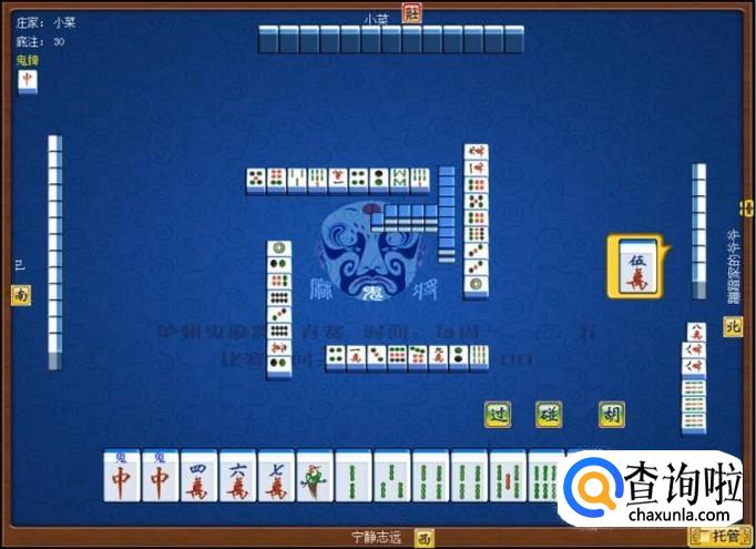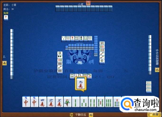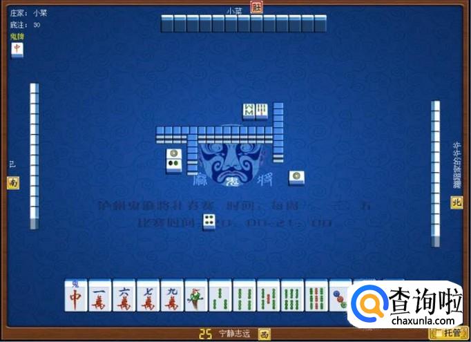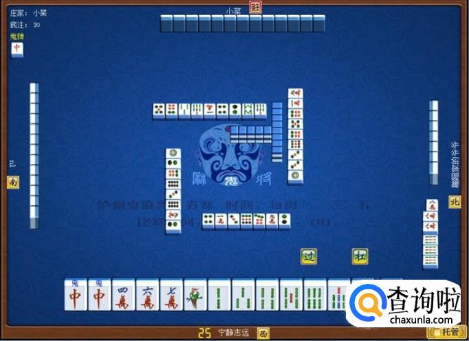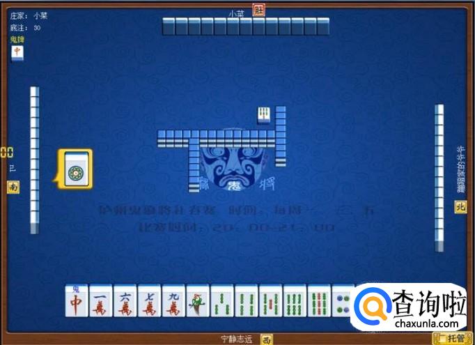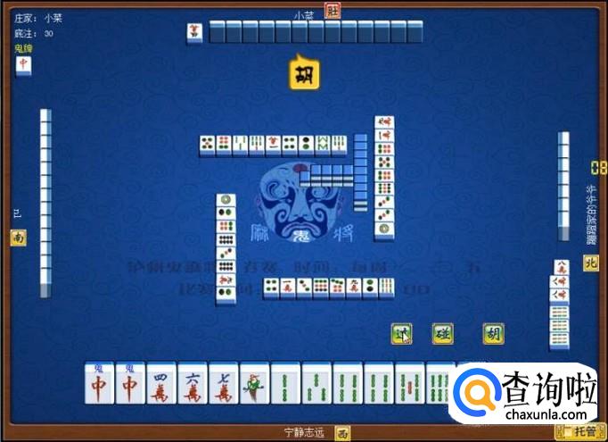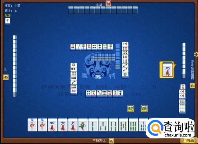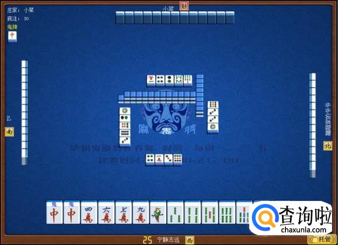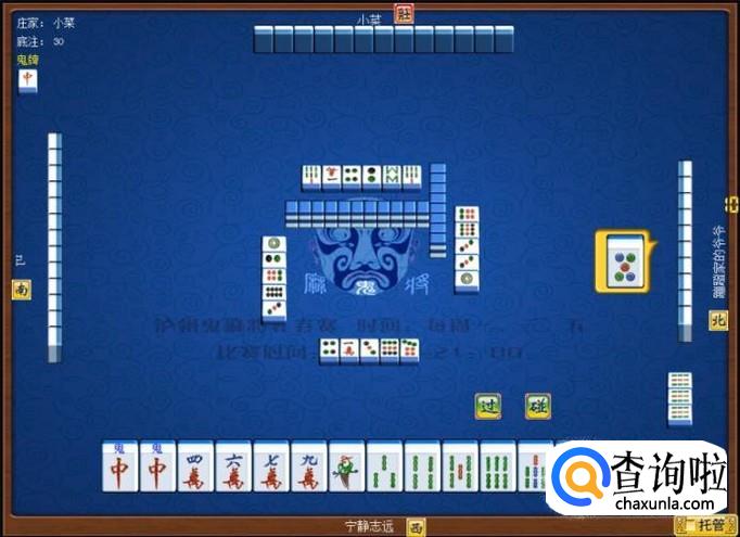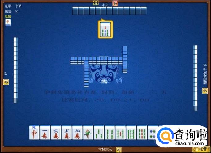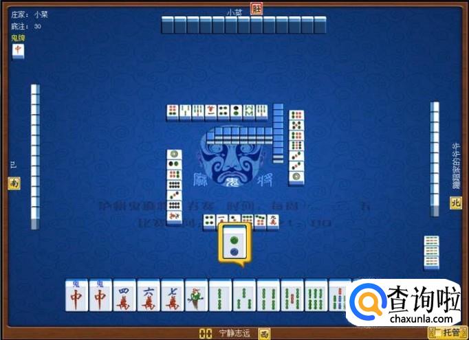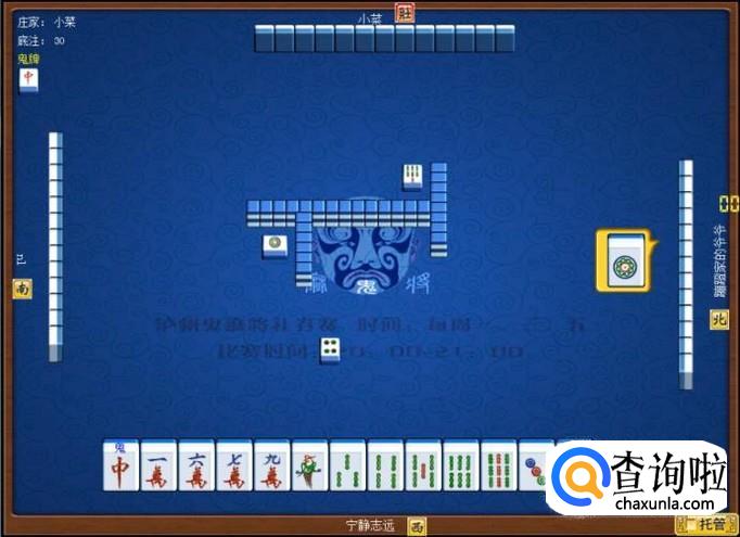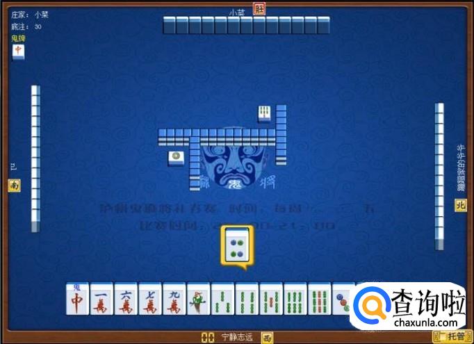 下家摸牌打三筒,庄家摸牌打四筒,顶家摸牌打八筒。本家摸牌,本家摸到红中(鬼),本家打出九筒,这样,本家就打缺筒子这门牌了。