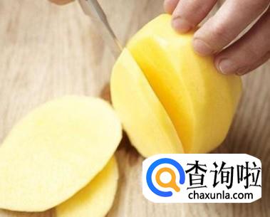 把土豆放在案板上,用刀把土豆切成均匀的厚片。