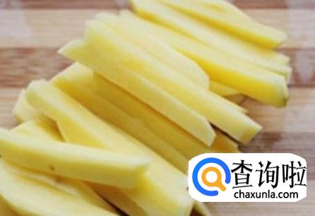 一手按住土豆片,另一只手用刀再把厚片切成均匀的竖条,宽度要一致。