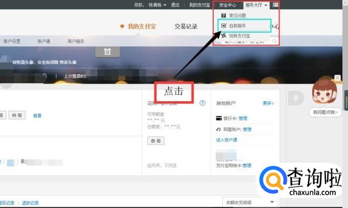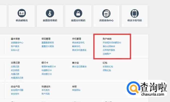 点击“自助服务”进入下一个页面,在”账户服务“找到”账户自助“,如图所示。