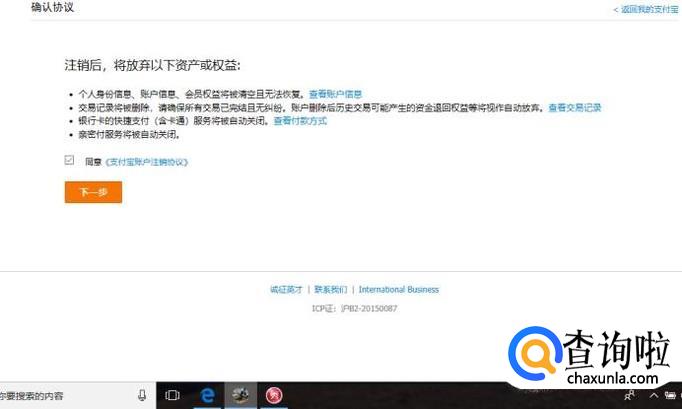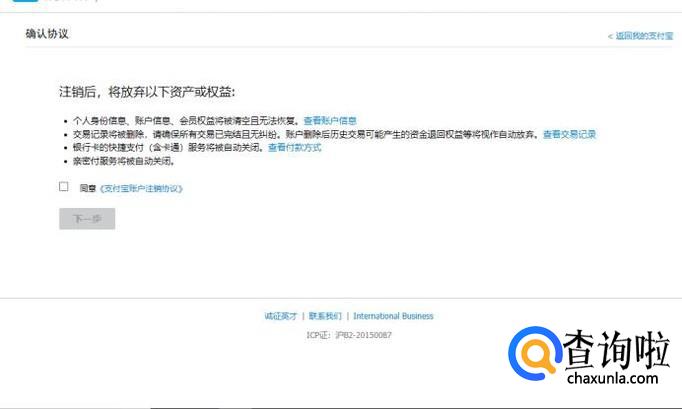 点击√选“同意《支付宝账户注销协议》”并再点击下一步,如图所示。