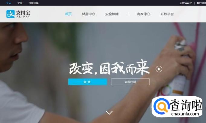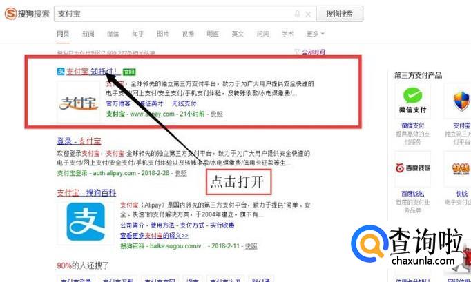 打开搜狗搜索,搜索“支付宝”,点击链接进入支付宝官网首页,如图所示。