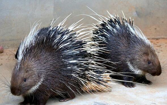 豪猪的脾气有点火爆,身上的刺就是它的防身武器。一旦遇到敌人袭击,它会把刺针竖起来当防卫。豪猪不是猪,其实它和老鼠一样,属于啮齿目,不过身披尖刺,尖刺可以用来防御掠食者。因为豪猪是杂食性动物,和猪很像,也正因此被人们称为“猪”。