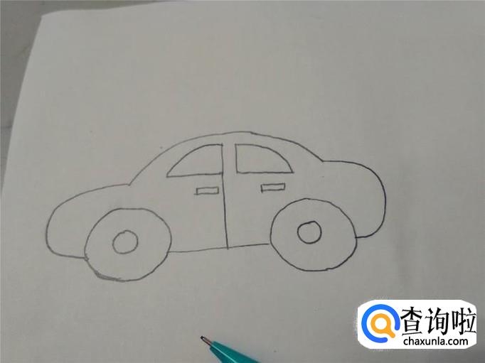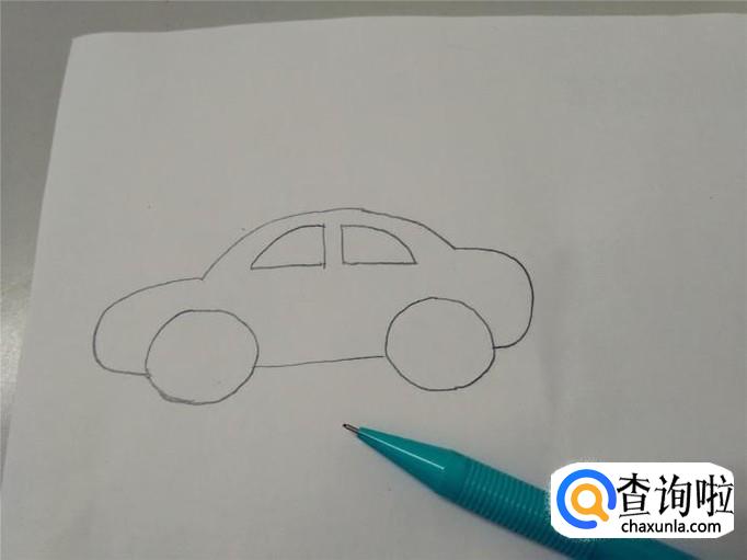 先画车的轮廓,上面鼓鼓的是车顶,两侧鼓出来的是车的前后两端,底下留出两个车轮的宽度,中间只画一横线,表示车的底盘。