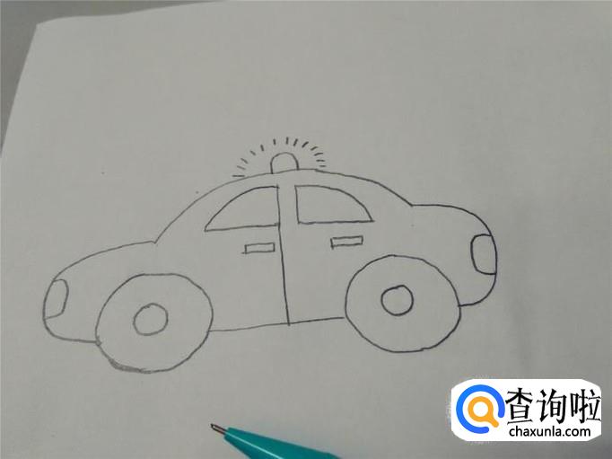 最后在车顶上画一个半圆,表示警车闪烁的警灯,在灯的外面再画一圈小短线,表示车灯在闪。到此,警车就画完了。你学会了吗?