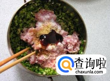 将猪肉,韭菜,生抽,味精,花椒,豆瓣酱,十三香,葱姜蒜混合均匀。