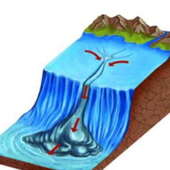 海底堆积的松散沉积物在暴风浪、地震以及海底滑坡等因素的诱发下发生崩塌,能够迅速与海水混合形成泥沙混杂的海底“泥石流”,科学家将其称为海底浊流。浊流是一种载有大量悬浮固体颗粒而又十分浑浊的高密度水流,其悬浮物质包括沙、粉沙和泥,有时还携带砾石。由于浊流的密度很大,在重力驱动下成束状或面状顺坡向下流动,流速可以超过20米/秒,在平缓地带会堆积成扇形的“浊积扇”。浊流多发生于大陆边缘地区,是将陆源物质由浅海输送到深海的重要机制。由于它具有很高的密度,因此能以极快的流速和动能沿着大陆坡下滑,其巨大的能量对海底具有极强的侵蚀和破坏作用,可拉断海底的光缆,切割陆坡形成陡峭的峡谷,并形成特有的冲刷痕、沟痕和槽痕等。