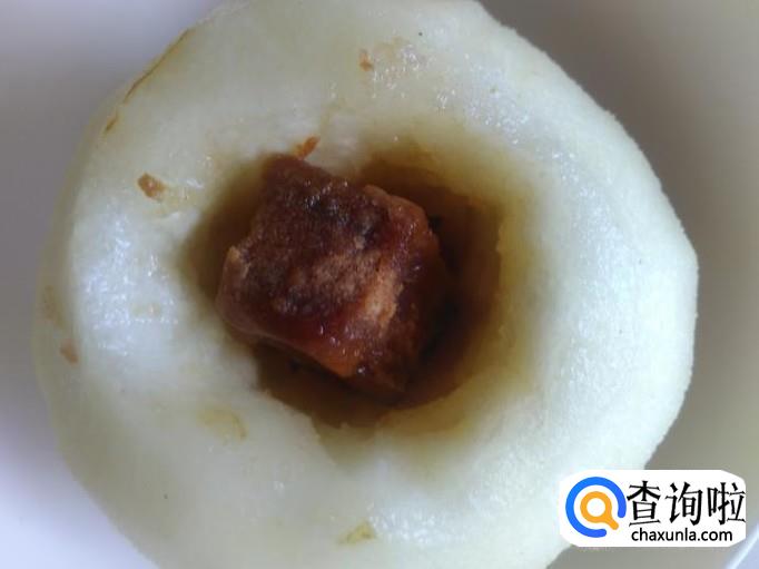 把红糖枸杞填到雪梨洞里。