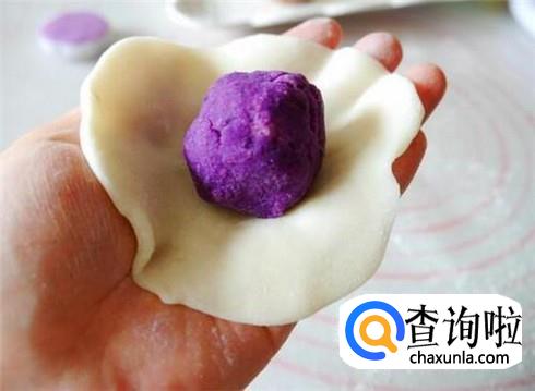 取适量的面团摊开,把紫薯馅包在里面,包好。