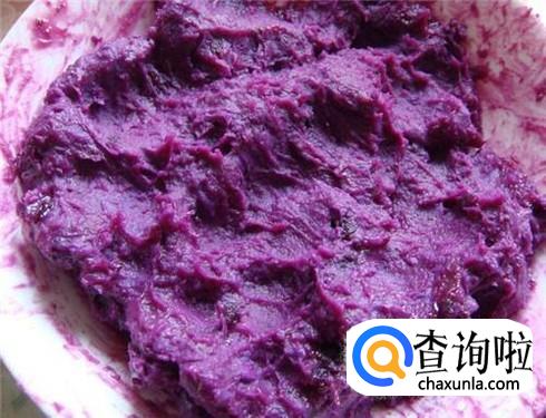 然后制作冰皮月饼的馅料,把紫薯蒸软,用勺子压成泥,然后放入少许白糖和牛奶,搅拌均匀,放入冰箱里冰冻成块。