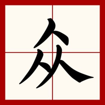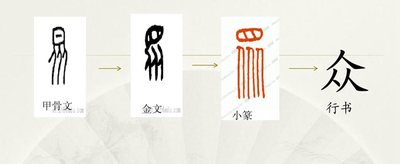 会意字。甲骨文上部为“日”,即一轮悬空的烈日,其下部为三个人(部分字形作二人),“三”在古代表示多数,三个“人”即为众人。合起来的意思是:许多人在烈日下从事劳动。西周金文的“众”西周金文的“众”,将甲骨文“众”字上的“日”字换成了“目”字。小篆的“众”字承金文而来,仍然从“目”。汉代隶书基本沿袭小篆。楷书分化出两种写法,一支上部变为“血”,下部三个人整合成“乑”;另一支上部作横目“罒”,中间的“人”变为一撇一竖,后来简化为三人呈品字形排列的“众”字。