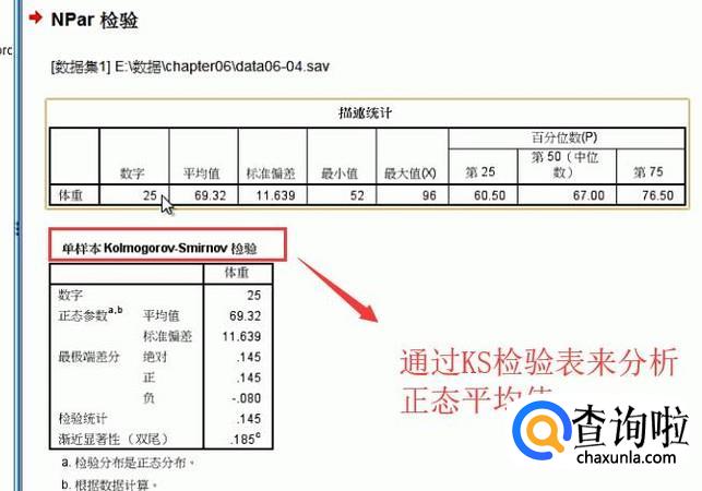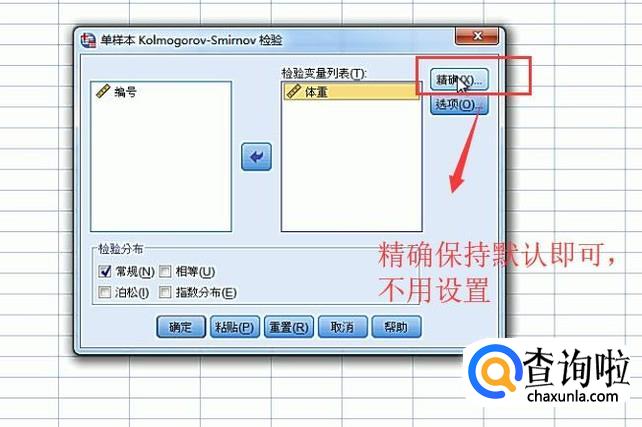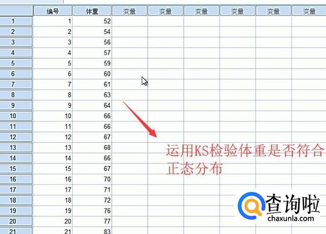 数据导入进来以后我们下面就需要借助单样本K-S检验来查看体重列是否符合正态分布,如下图所示