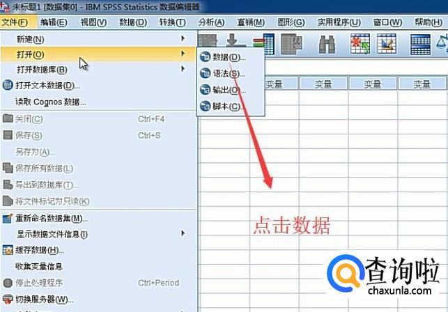 首先我们打开SPSS软件,点击文件菜单,接着选择数据选项,如下图所示