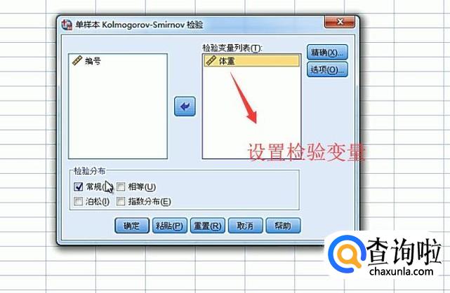 接着在弹出的单样本K-S检验界面中添加检验变量,如下图所示