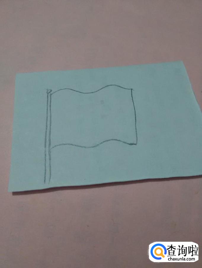 在旗杆的右侧画两条波浪形的曲线,在两条波浪线的末端,用一条竖线连接起来,表示正在飘扬的旗子。