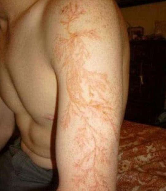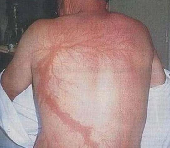 据统计,一个人被雷劈中的概率大约为60万分之一,并且雷电当中所蕴含的能量也是不可小觑的。当时有一位来自美国的男子也是遭到了雷击,而幸运的是他还活了下来,剧这名男子口述,当时被雷劈中之后,衣服全部都烧焦了,人虽然说并没有事,可是身上却留下了特殊的印记。