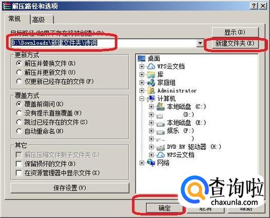 弹出“解压路径和选项”选项框,默认文件解压以后是保存在和压缩文件同一个目录下面的,我们也可以点击“新建文件夹”另外选择保存路径。选择完以后,点击“确定”。