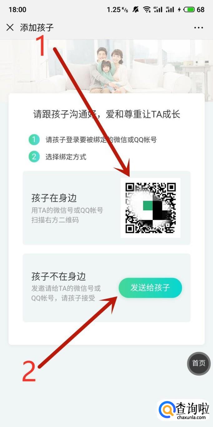 进入下一页面即可看到绑定方式,可以用孩子微信扫描图示位置二维码或者将邀请发送到孩子微信或者QQ上,如图所示。