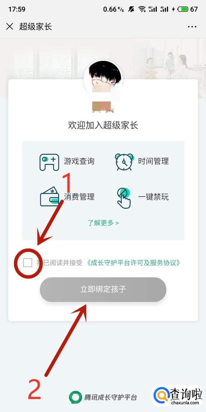 进入之后,勾选图示位置的许可及服务协议,然后点击“立即绑定孩子”,如图所示。
