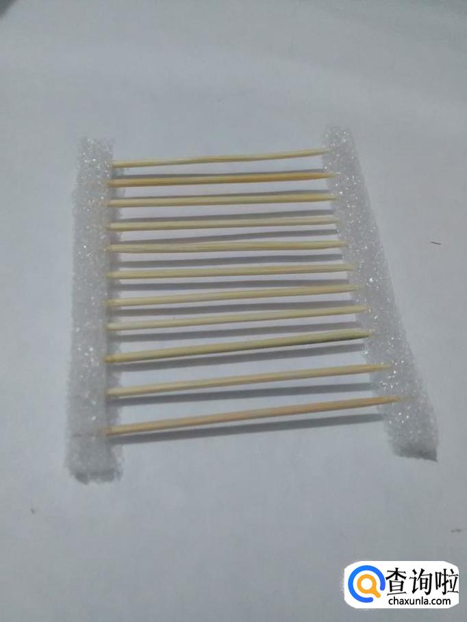 将牙签的一端扎进一根泡沫的一侧,整齐排好。