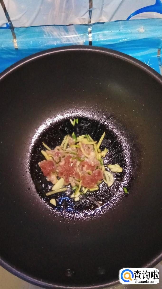 炒锅中放入适量油,油热后,将腌制好的肉丝放入锅中炒香。